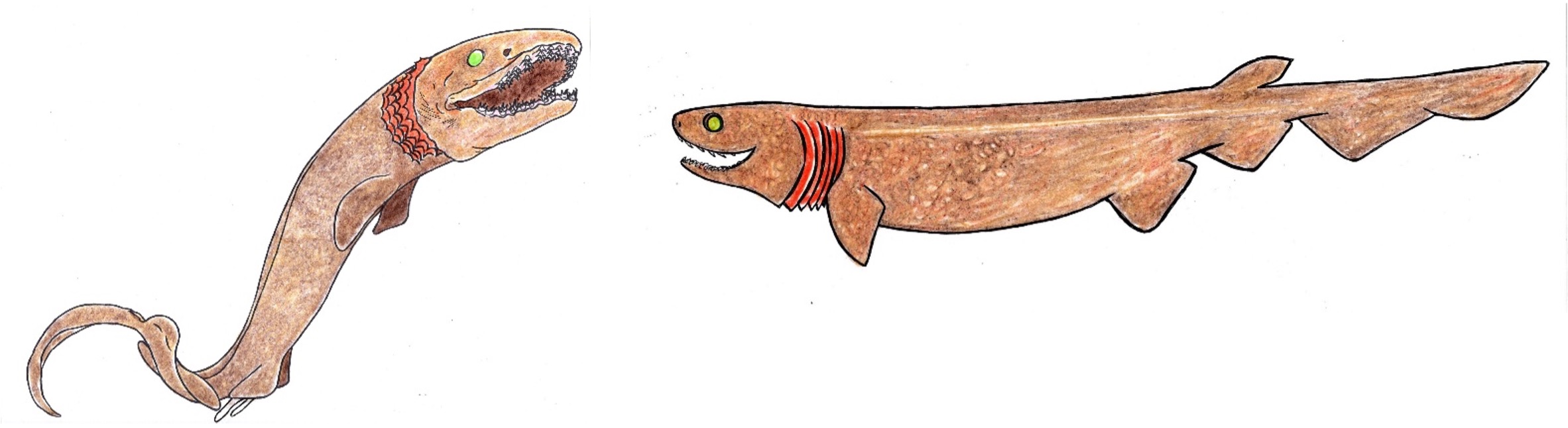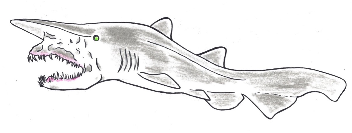 sharkは、このエラの特徴からついた名前です。このエラは酸素の少ない深海で少しでも多くの酸素を集めるための工夫だと考えられていて、三つ又状の独特の形をした歯をしています。イカなどをひっかけて食べるのに便利そうです。