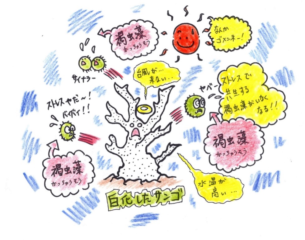高い海水温をストレスに感じた褐虫藻が、サンゴの体からいなくなり、白化しました。
