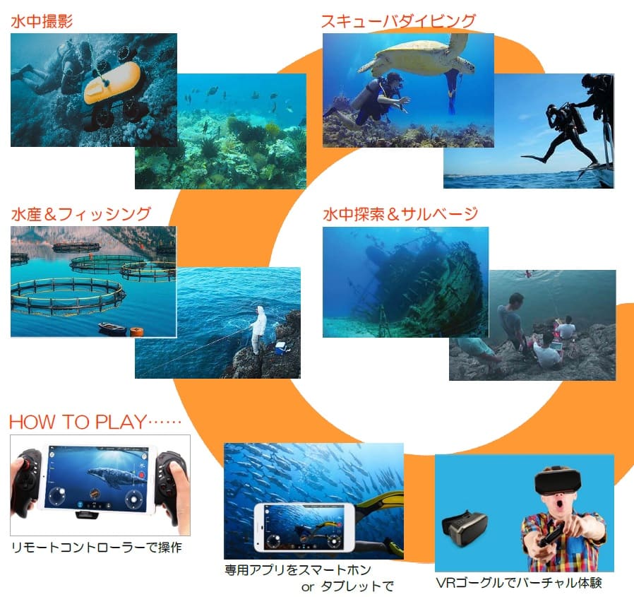 スマートフォン/タブレットアプリで操縦を行い、水中画像やビデオを撮影したり、釣り場を探したり、水中の調査を行うことも可能です。